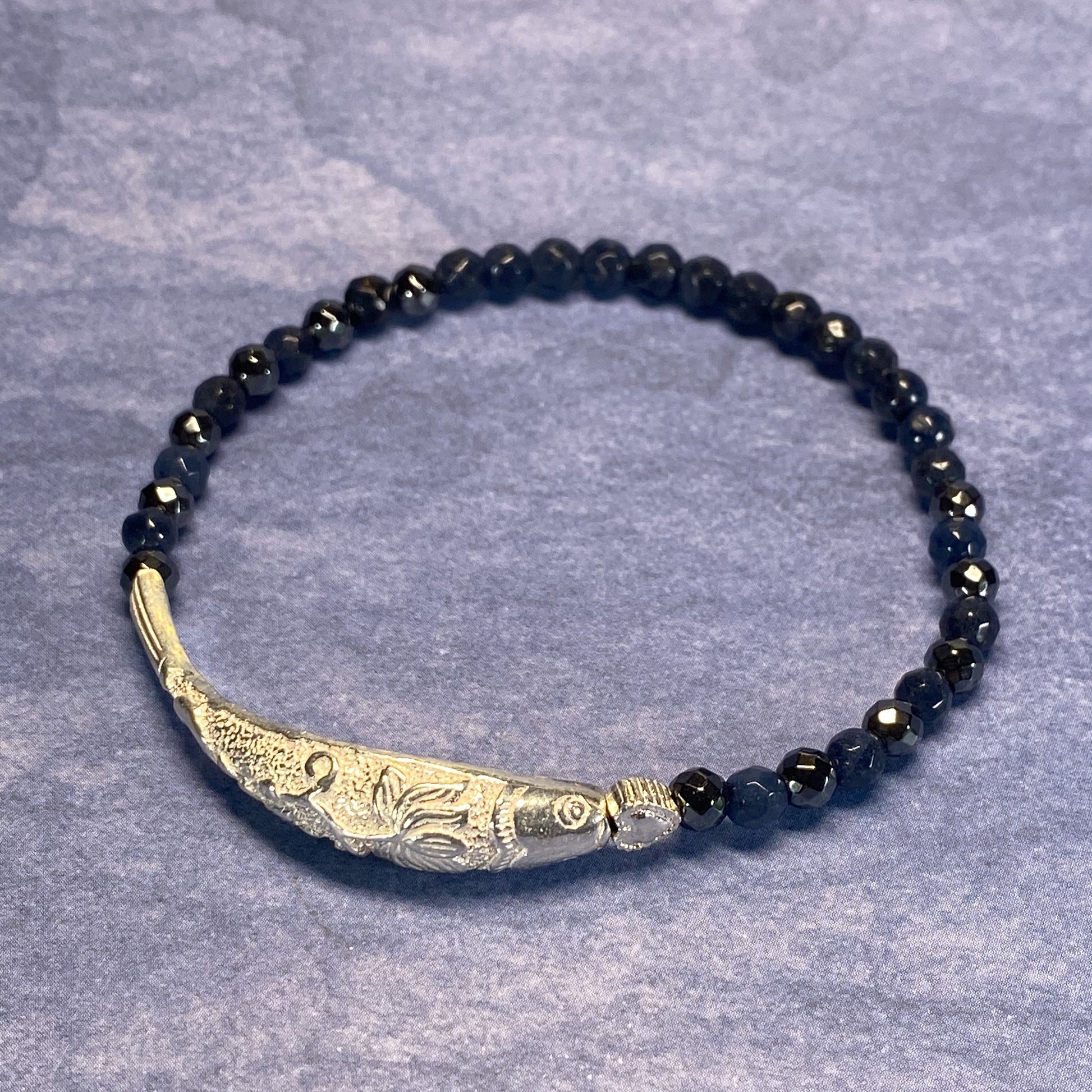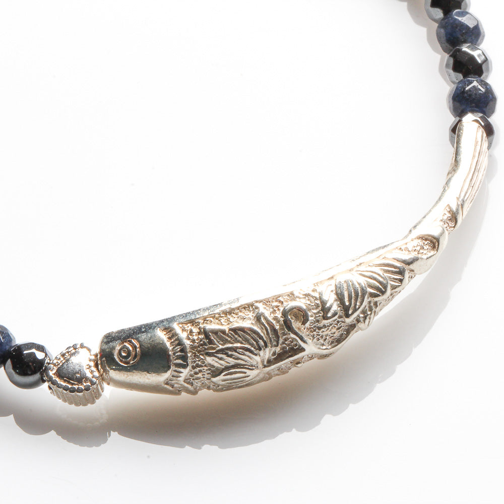 4MM DUMORTIERITE, 925 SILVER FISH AND HEART BRACELET