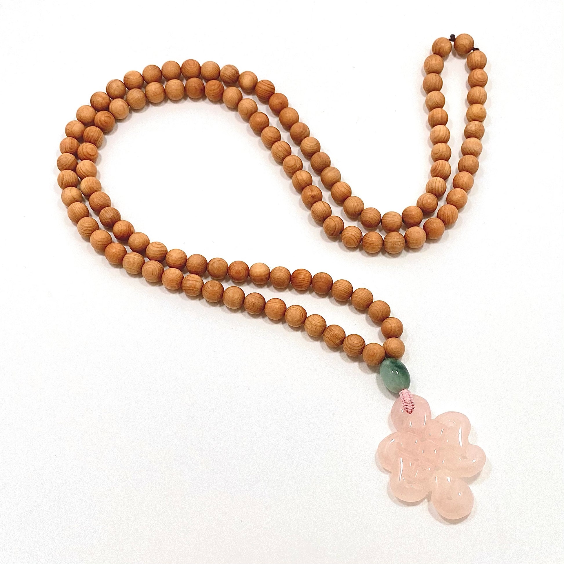 THUJA WOODEN BEADS, JADE, ROSE QUARTZ MYSTIC KNOT NECKLACE