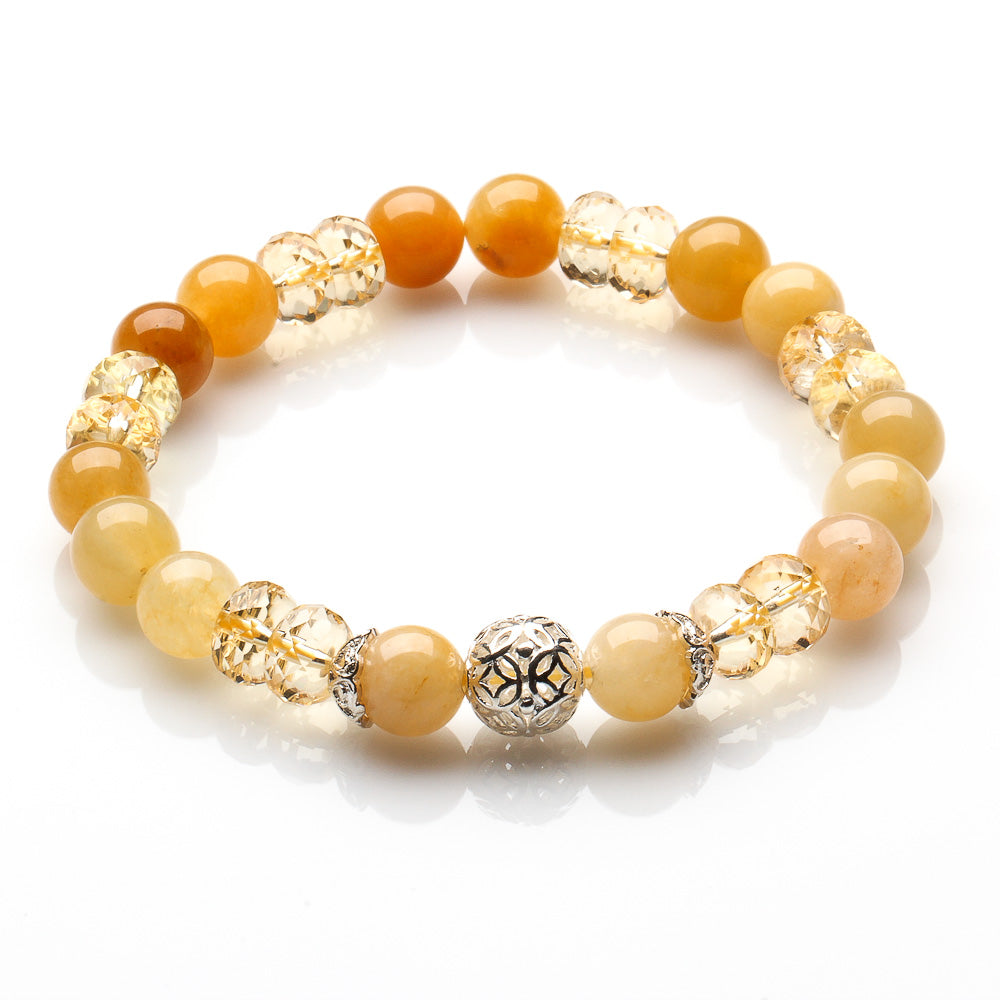 We used: 8mm Yellow Jade Beads, 8mm Facetted Hamburger Citrine Beads and 10mm 925 Silver Coin Outline Bead with Elastic String