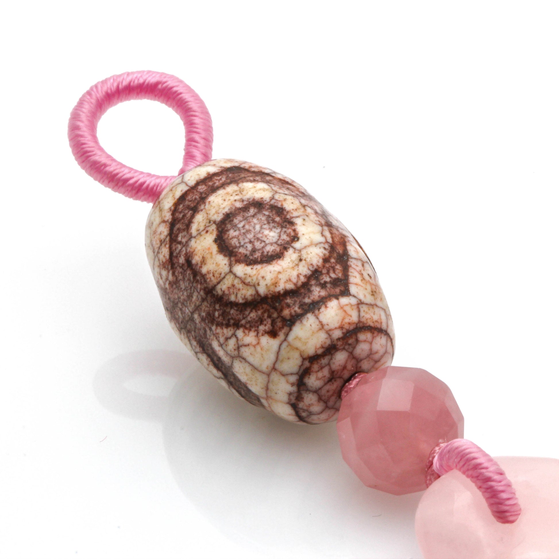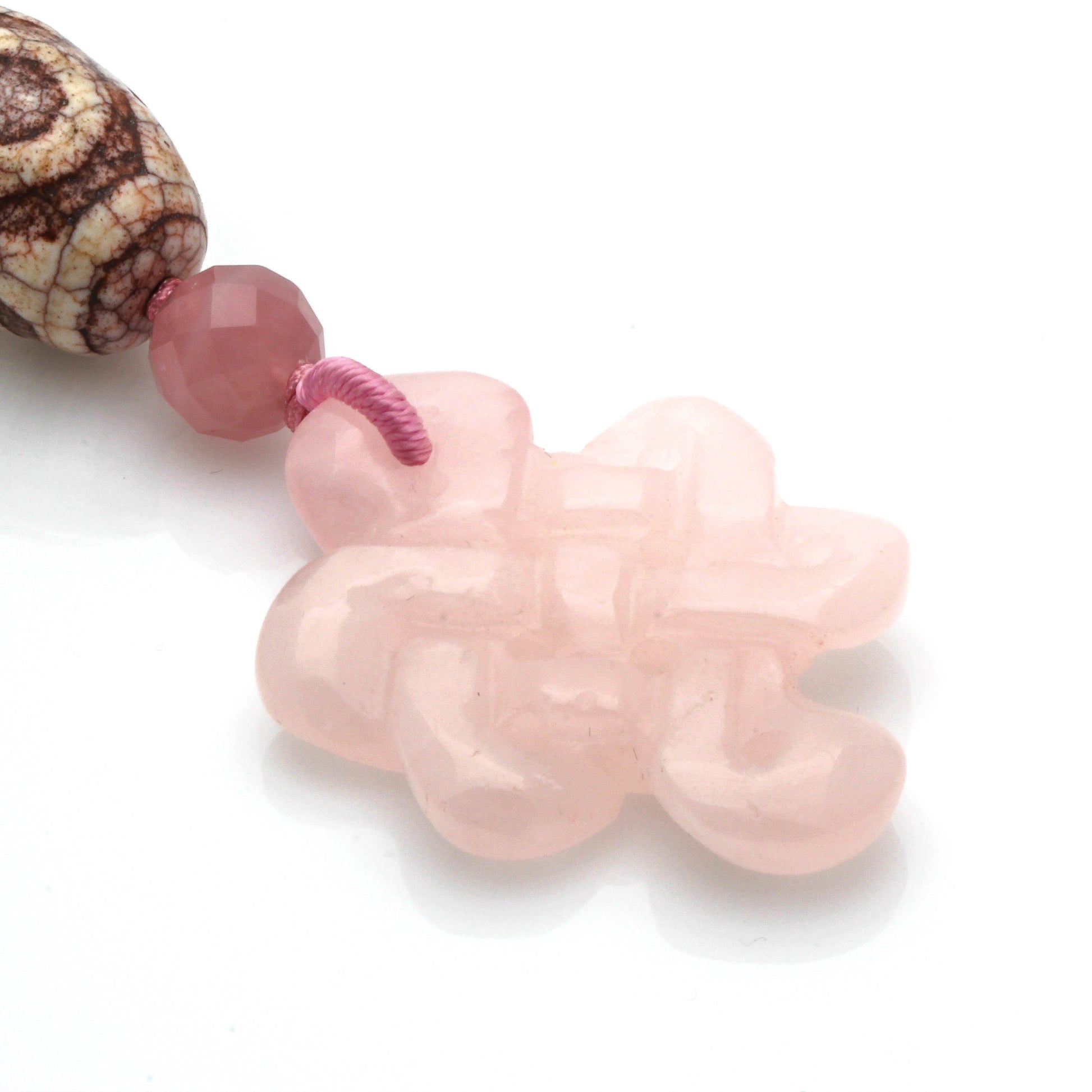 We used : 25 X 20mm Dragon Vein 3 Eyes Dzi, 10mm Faceted Madagascar Rose Quartz Bead, and 33 X 44mm Rose Quartz Mystic Knot