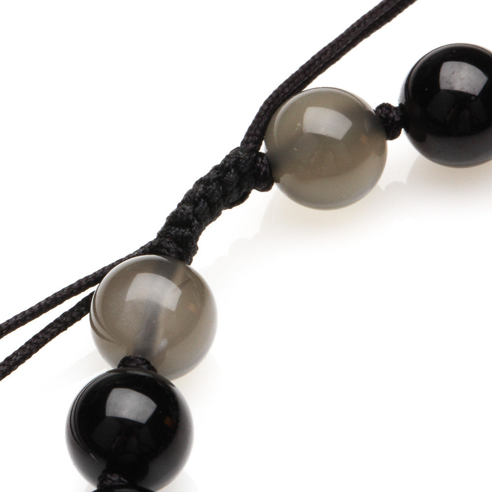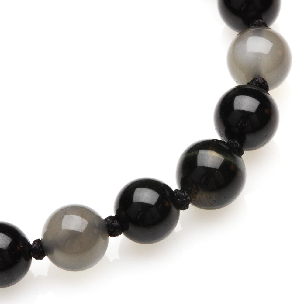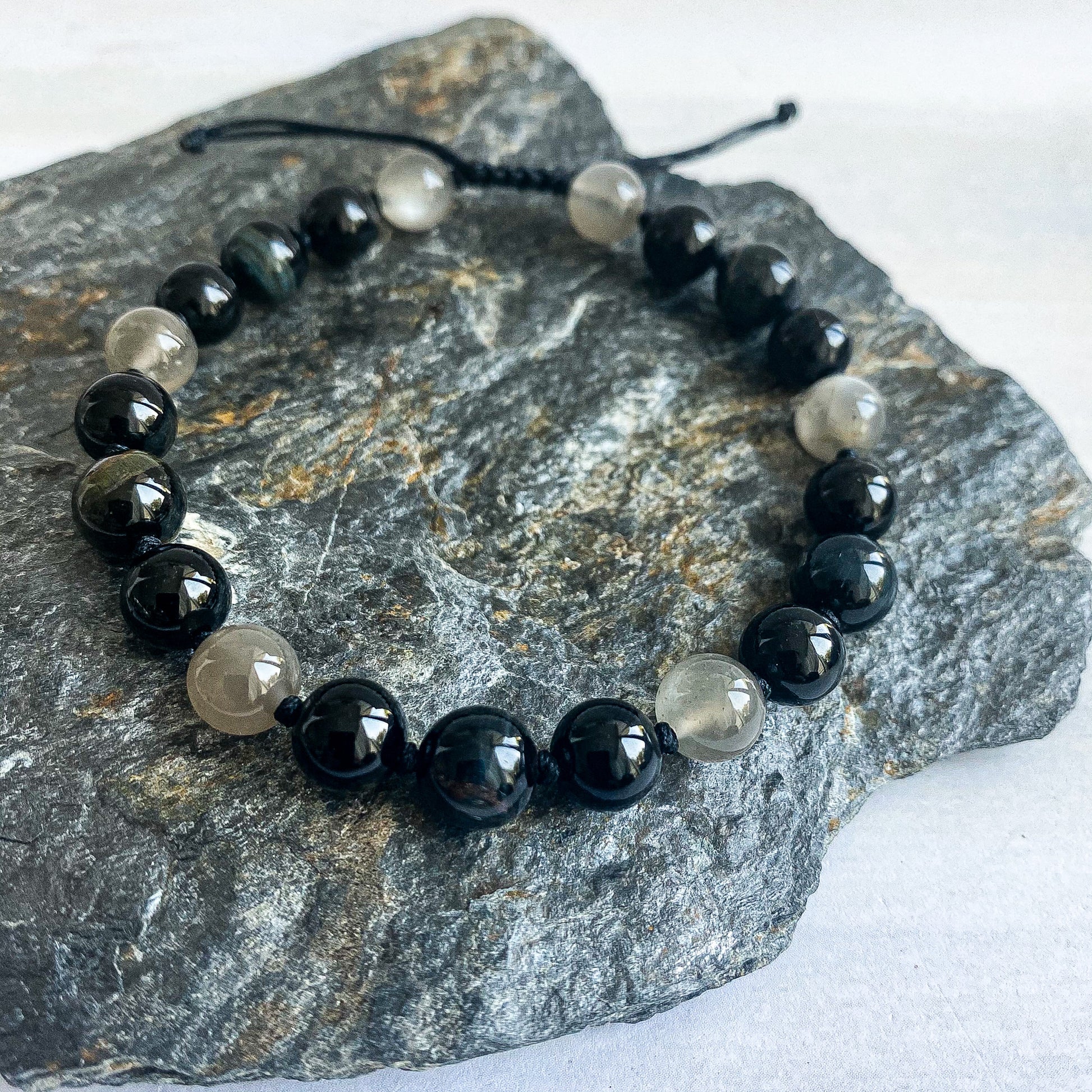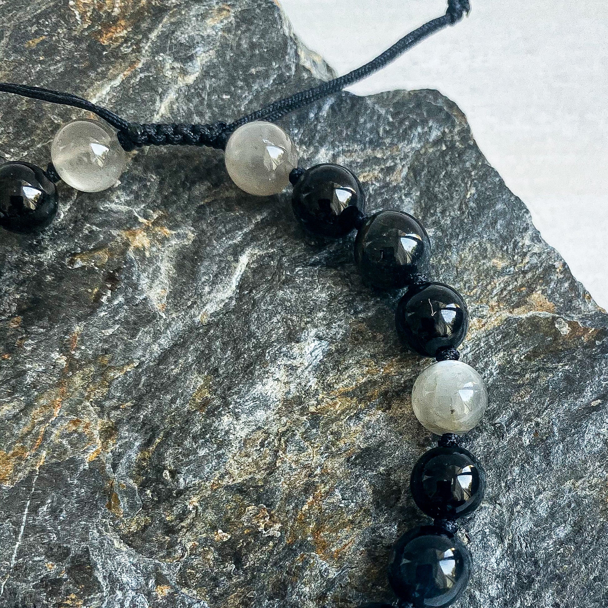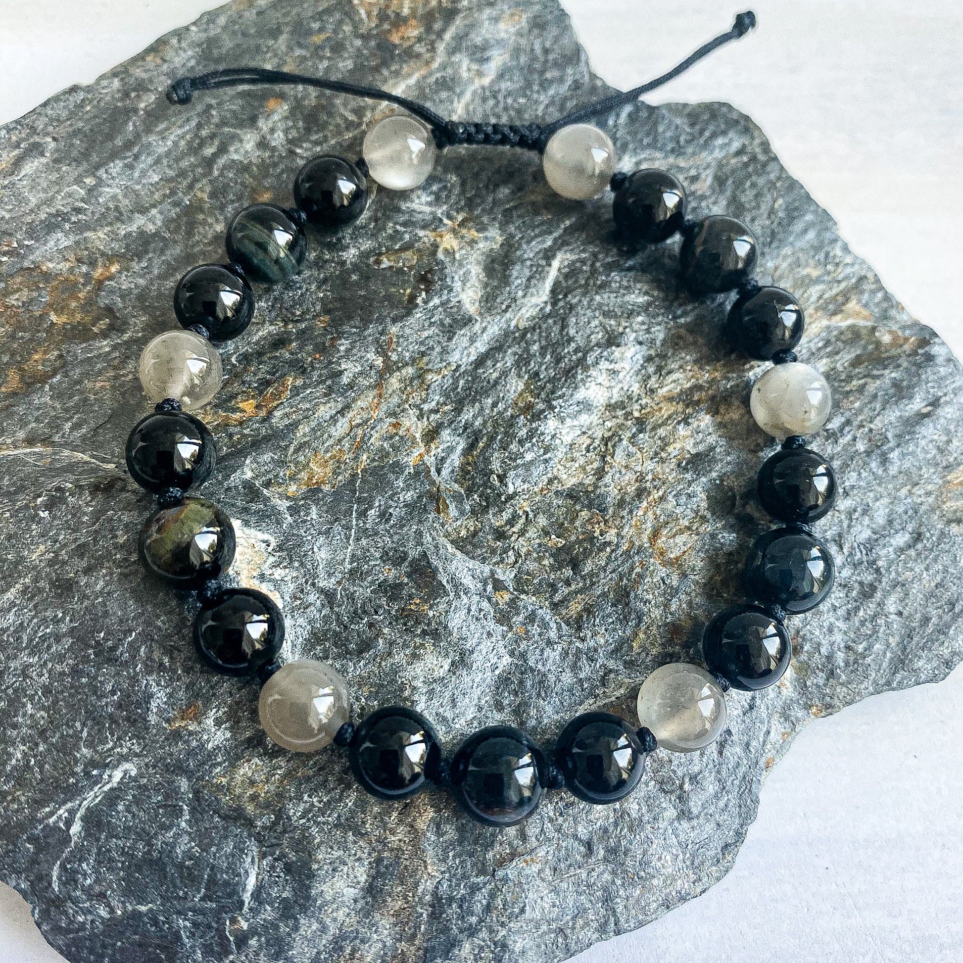 We used: 8mm Grey Moonstone, Blue Tiger's Eye and Black Tourmaline Beads with Black String