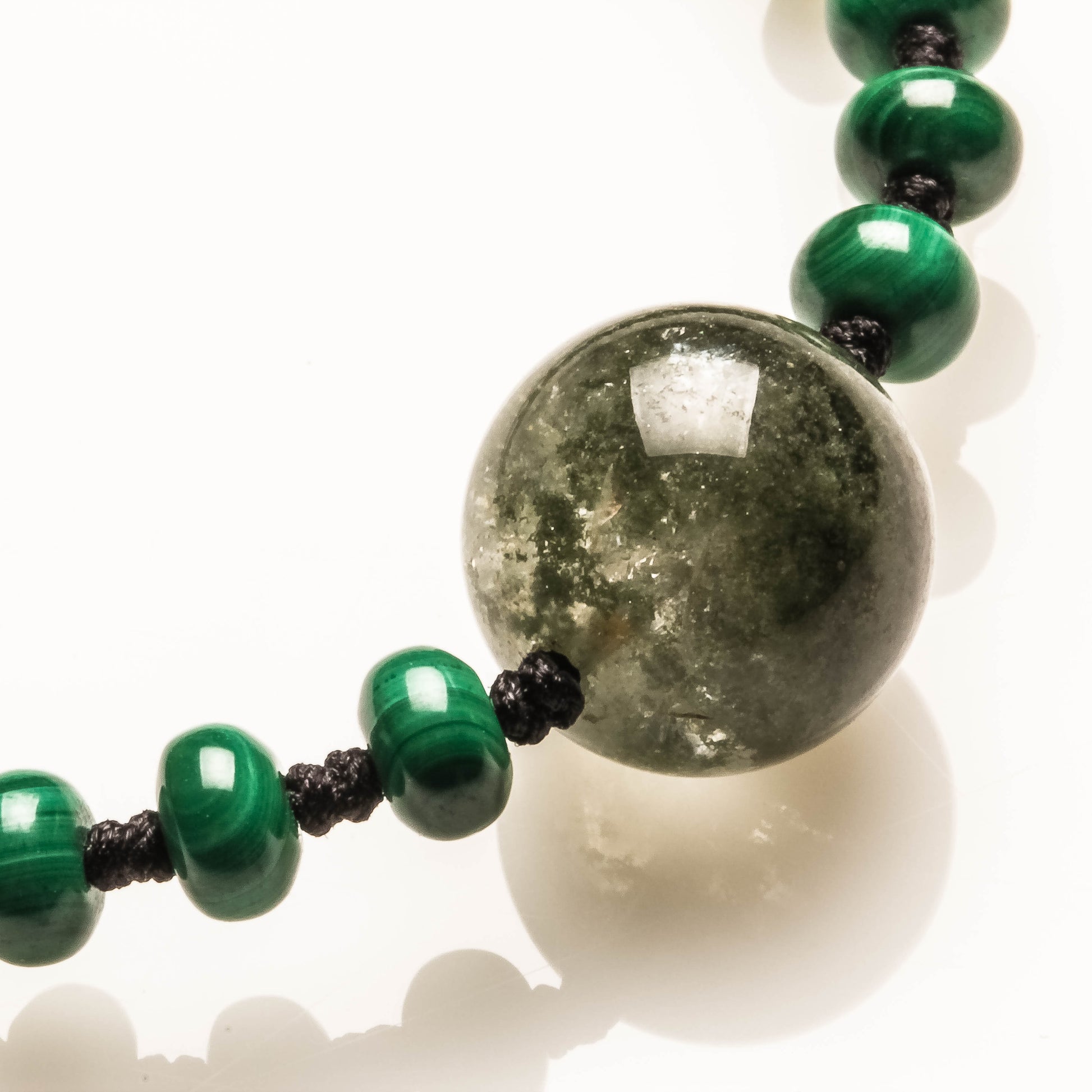 We used : 14mm Green Phantom with 6 X 4MM Malachite Abacus Beads with Black String