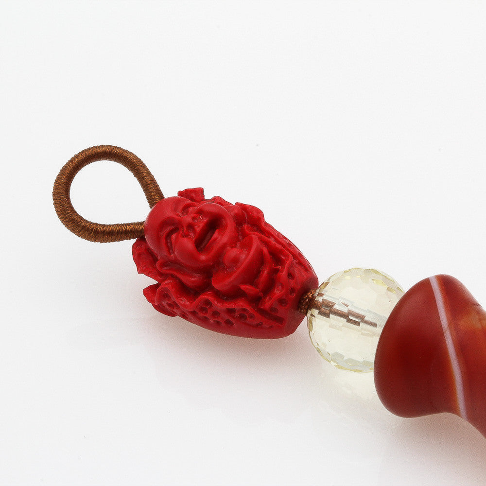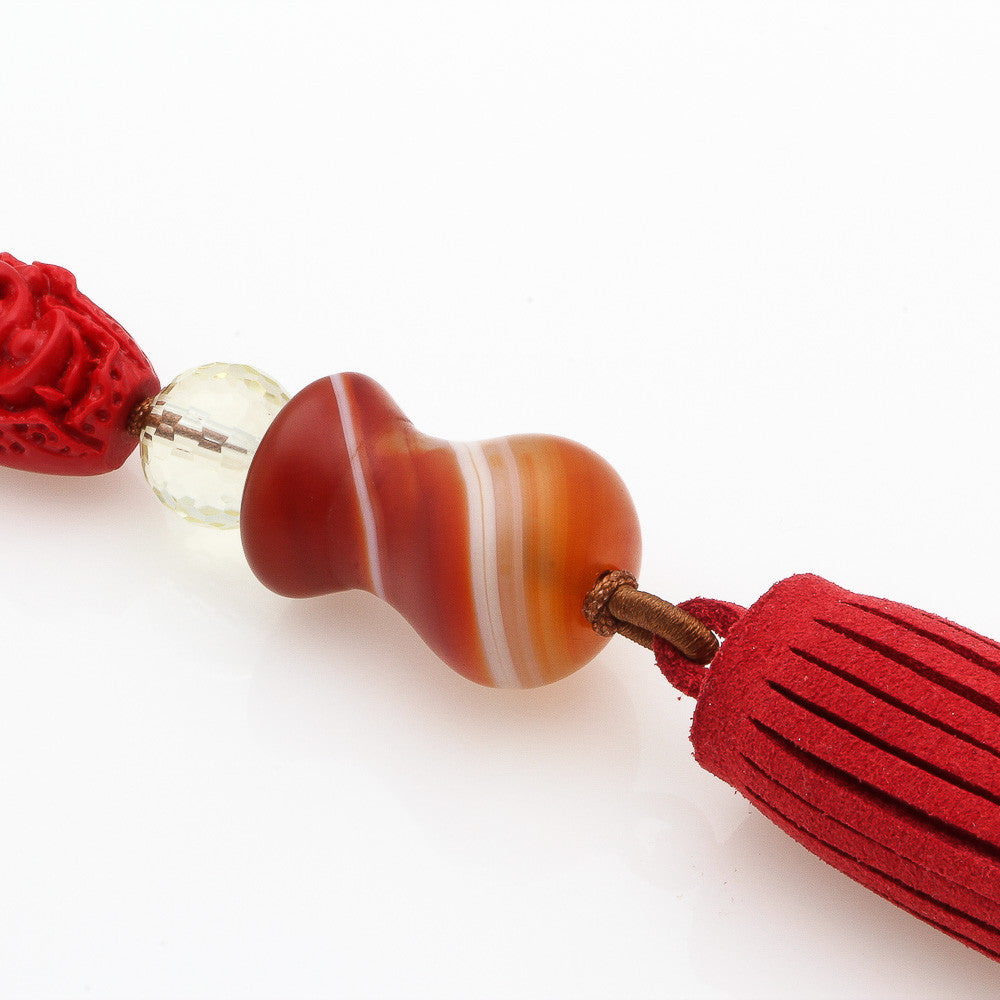 We used: Red Cinnabar Laughing Buddha Cabbage Bead, 10mm Faceted Lemon Citrine and Agate Vase with Velvet Tassel.