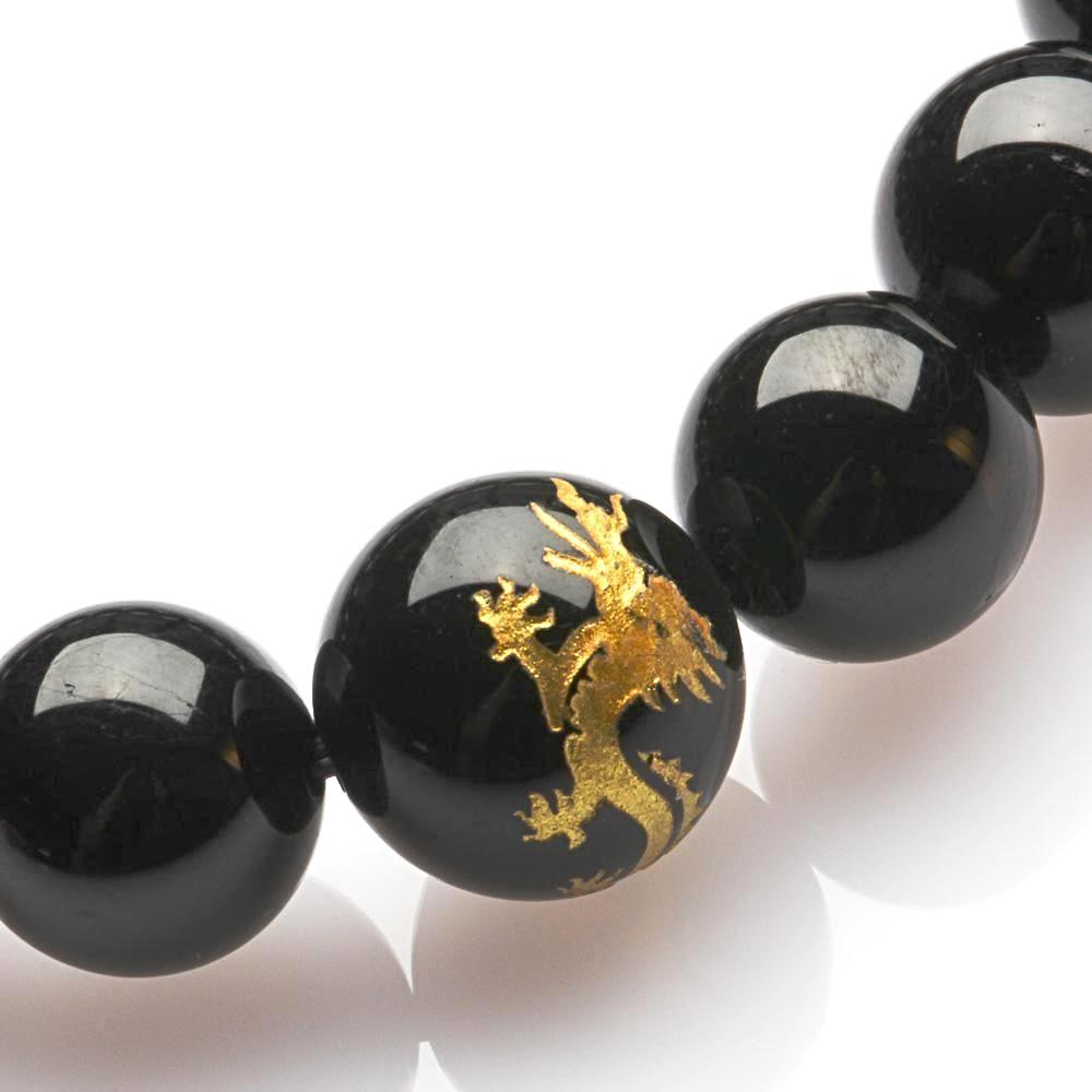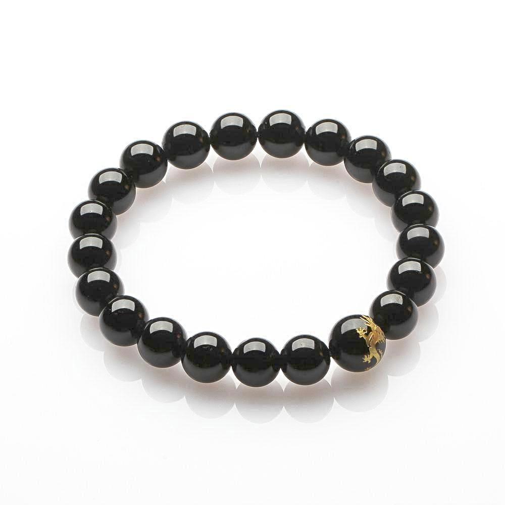 10MM BLACK TOURMALINE, GOLD LASER DRAGON BRACELET