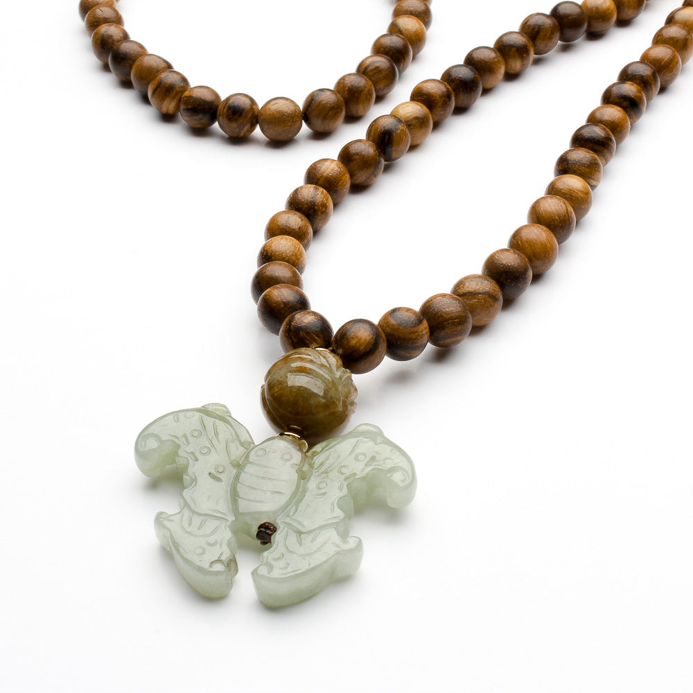 8MM WOODEN BEADS WITH JADE BUTTERFLY LONG NECKLACE