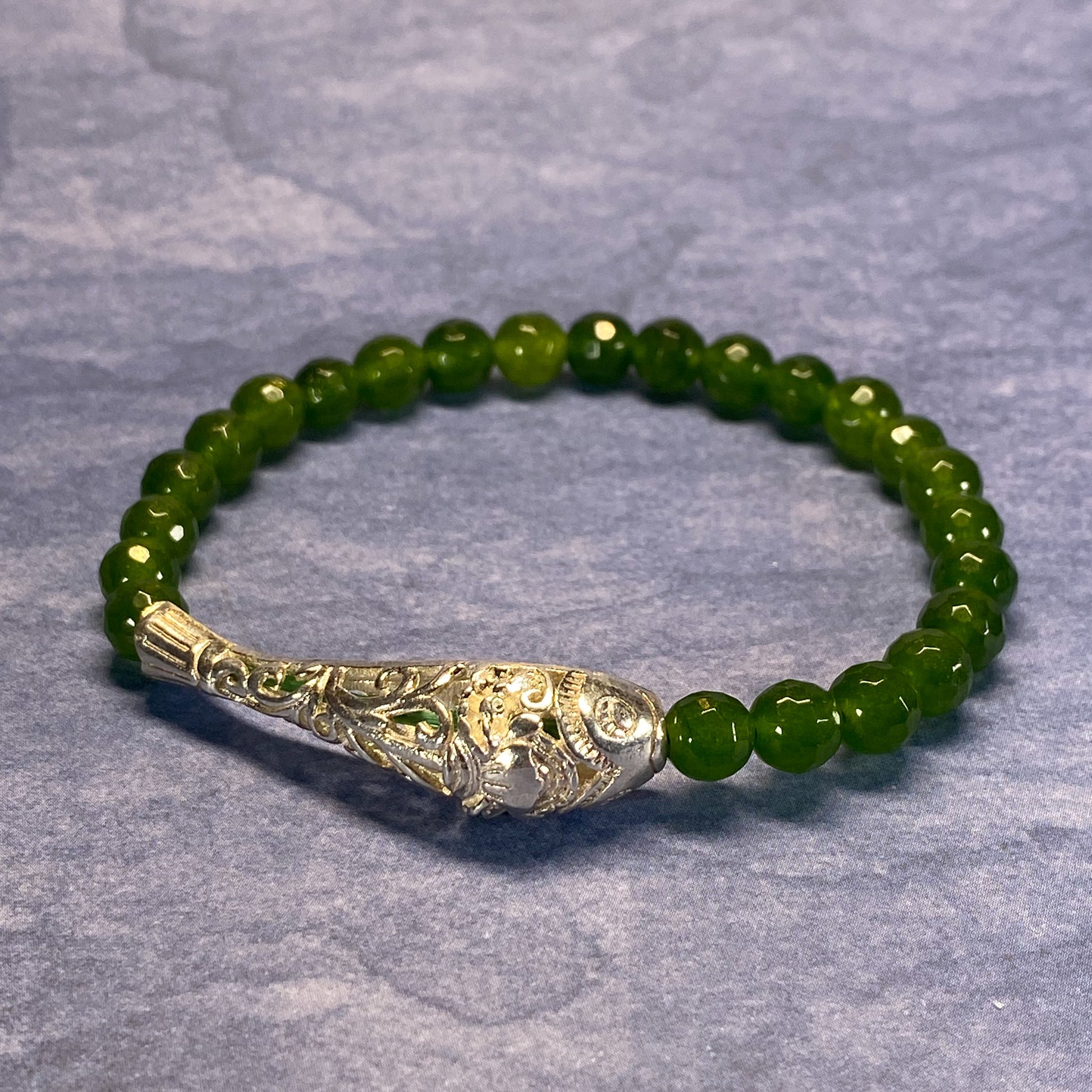 We used : 6mm Faceted Green Taiwanese Jade With 925 ID Fish Elastic Bracelet