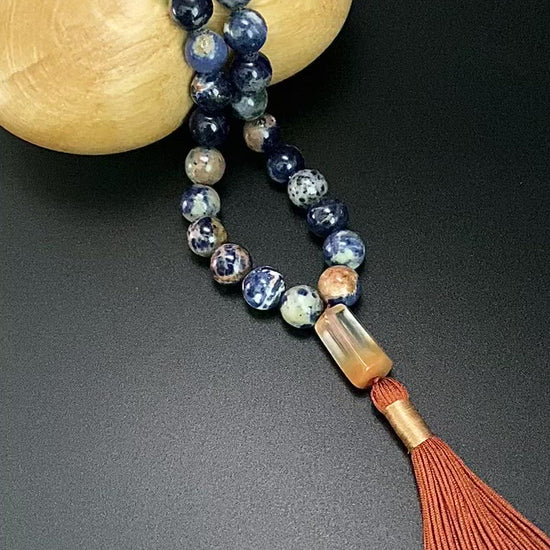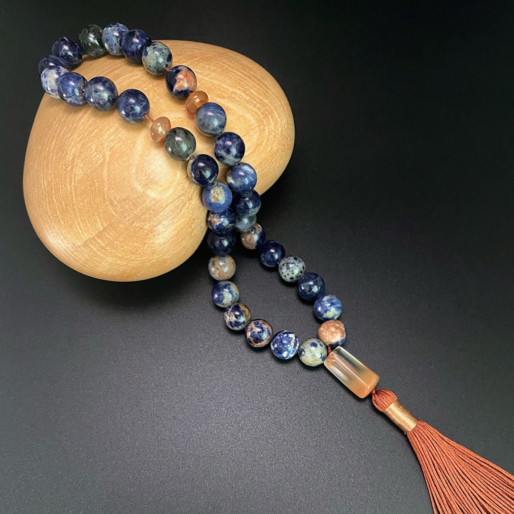 ORANGE SODALITE, RABBIT HAIR QUARTZ PRAYER BEADS