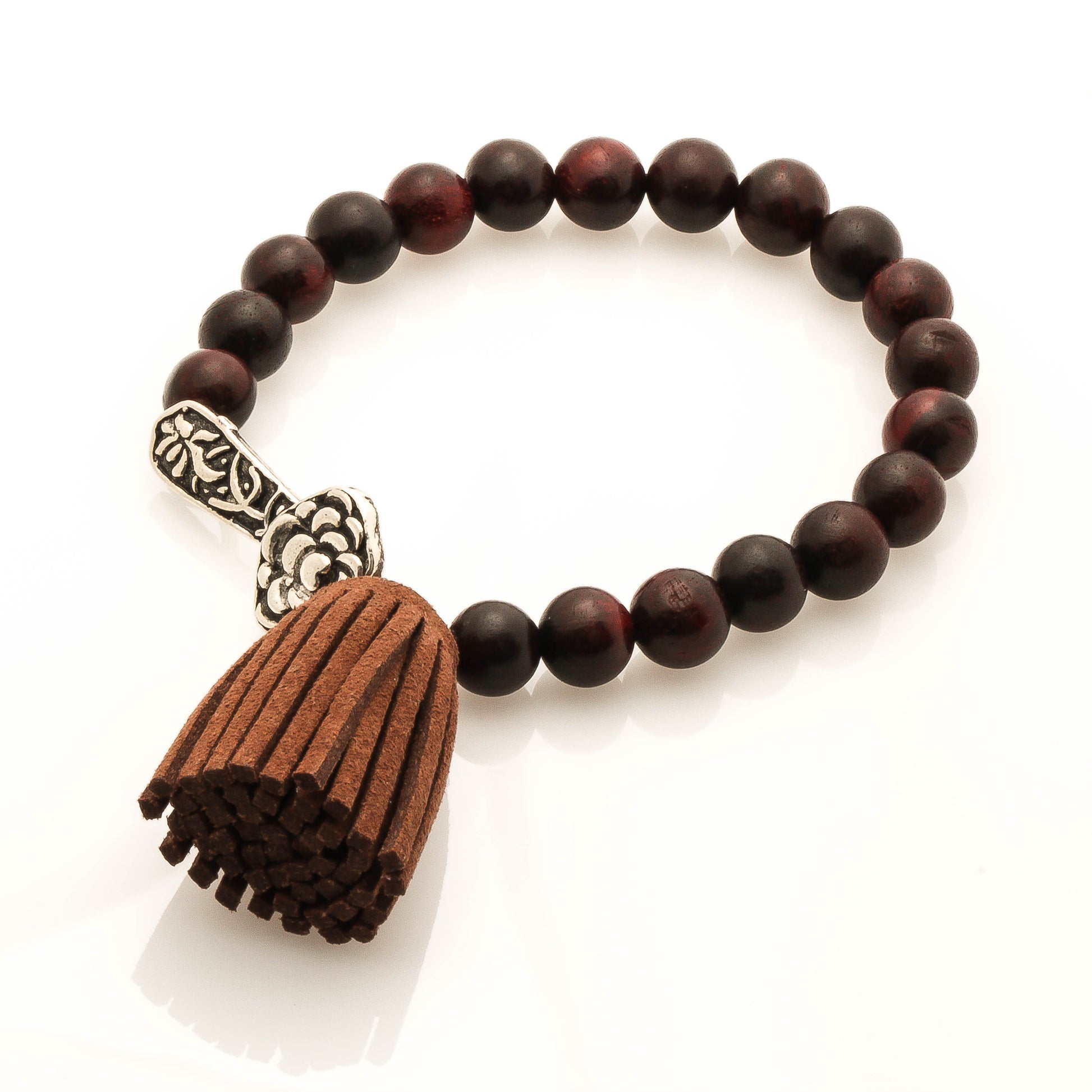 We used: 8mm Red Sandal Wood Beads, 925 Silver 2.3cm Ruyi with Brown Suede Tassel