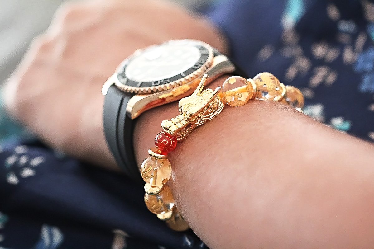 We used : 12mm Clear Quartz with Gold Laser Dragon Beads, Metal Gold Plated Dragon Head, 8mm Red Agate with Laser Chinese Coin, Metal Gold Plated Beads and Elastic String.