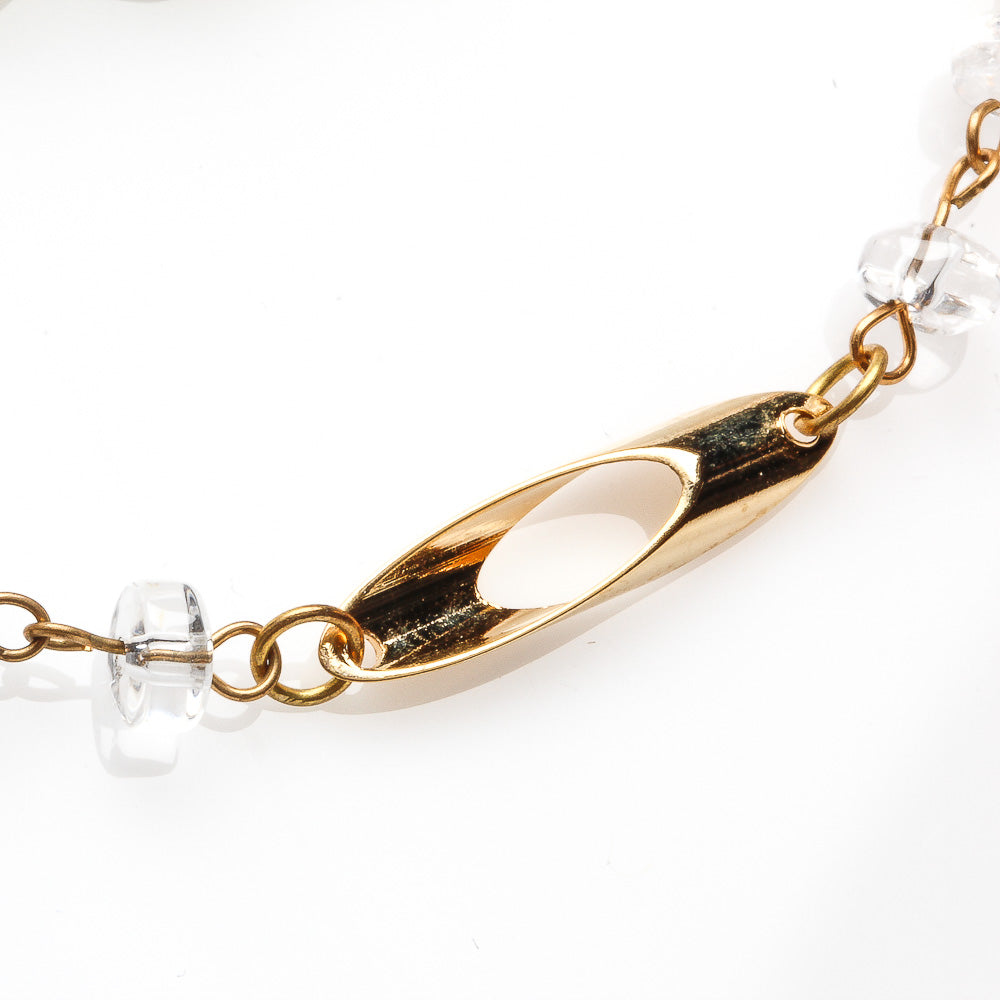 We used: 8mm Round Selenite Beads, 5x3mm Clear Quartz Hamburger Beads with Gold Plated Chain