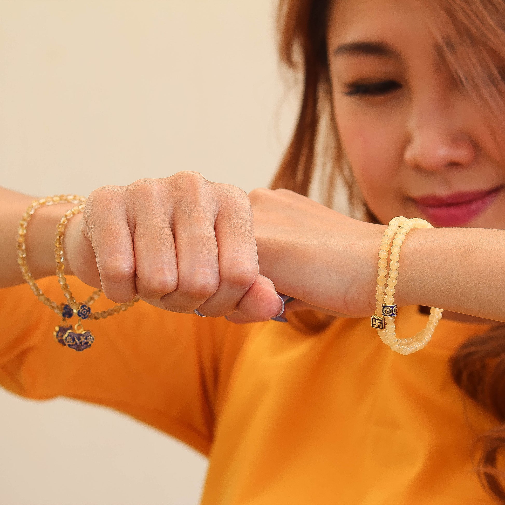 We used: 4mm Gold Rutilated Beads and 925 Gold Plated Enamel `Travel Safe' Charm with Elastic String