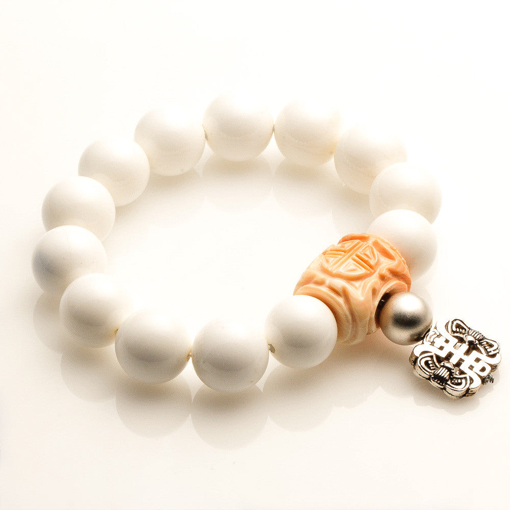 We used: 14mm White Tridacna Shell Beads, Peach Curve Tridacna Shell, 925 Matt Silver Bead and Longevity Symbol, with Elastic String.
