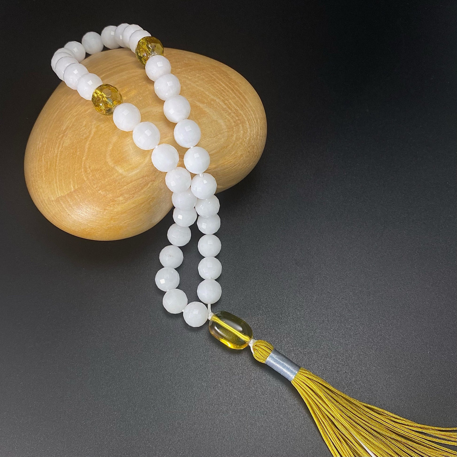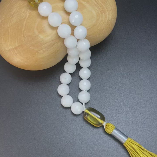 10MM FACETED WHITE JADE WITH AMBER PRAYER BEADS